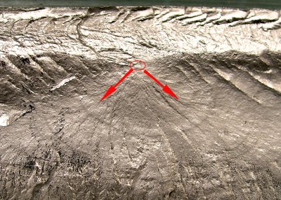 Es liegt ein Schwingbruch mit eindeutig identifizierbarem Bruchausgang vor. Bruchauslösend durch Kerbwirkung war ein singulärer grober nichtmetallischer Einschluß